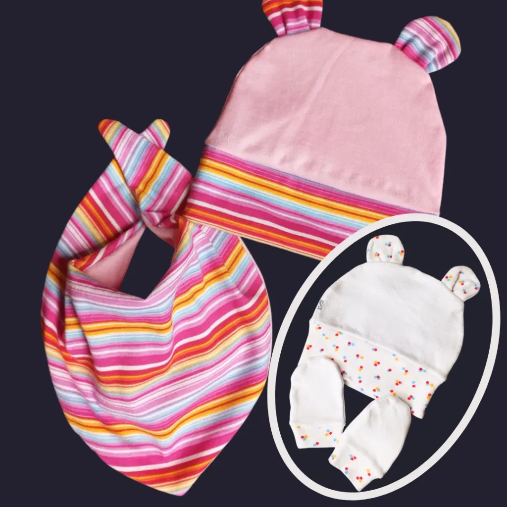 Adquirí este Molde/patrón Digital, elaborado y probado por mí, totalmente editable, de este hermoso Kit de Gorrito con orejitas, manoplas con puño y babero bandana de bebé para Recién Nacido, lista para la producción.